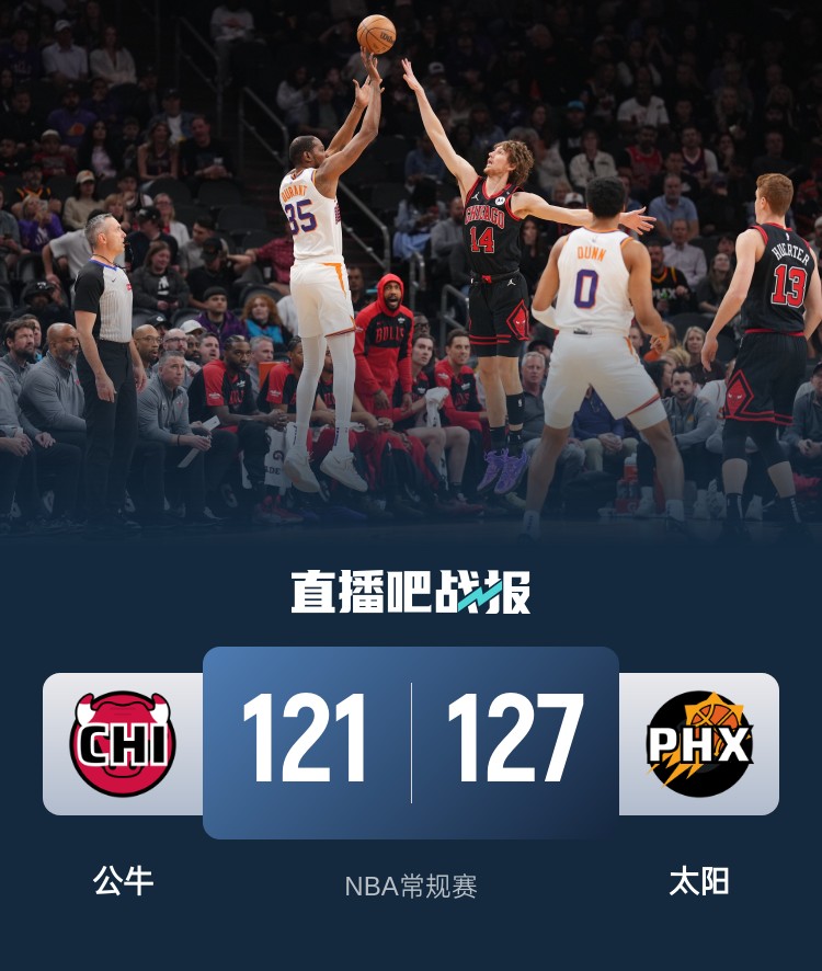 开场后太阳在布克和杜兰特的带领下抢占先机,理查兹内线也多次吃饼得手,公牛多点开花紧追不舍,太阳在第一节尾声一波10-0再次扩大优势。第二节两队围绕10分左右拉锯,杜兰特进攻效率依旧不错,武切维奇带队也接连砍分回应。易边再战,杜兰特和布克依旧手感火热,公牛多次掀起反扑势头都被太阳及时浇灭。末节布克延续手感又连续投进三分,场上分差被拉大到20分。此后公牛又努力掀起反扑一度追到只差4分,关键时刻布克连投带罚帮助太阳锁定胜局,最终太阳127-121击败公牛,太阳对阵公牛11连胜,他们在战绩上追平独行侠升至西部第十。