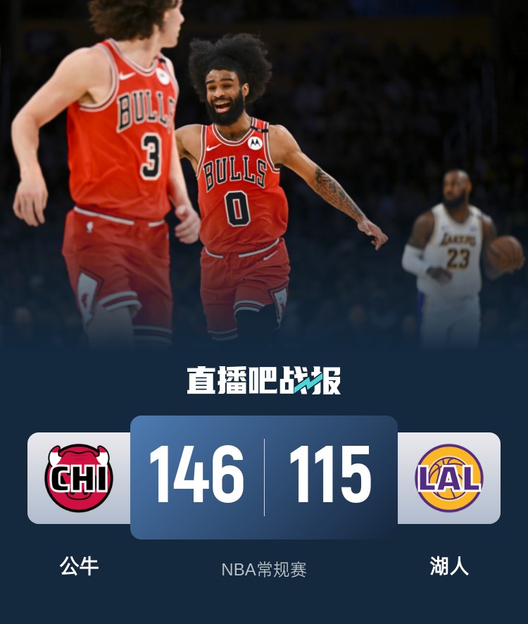 首节开打后双方迅速找到节奏,东契奇手感滚烫单节独得17分,怀特连投带罚单节16分强势回应,首节结束时公牛领先1分,次节回来,东契奇无人可挡再中4记三分,里夫斯续上火力贡献14分,但公牛多点开花守住优势,半场战罢,公牛依然领先3分。短暂休整后湖人继续紧咬比分,但怀特予取予求连续取分,公牛下起三分雨接连打出小高潮,三节结束后公牛已经领先15分,末节上来,基迪连送妙传率队牢牢占优,湖人追分未果早早撤下主力,最终公牛146-115大胜对手,湖人排名再度被掘金反超降至西部第4。