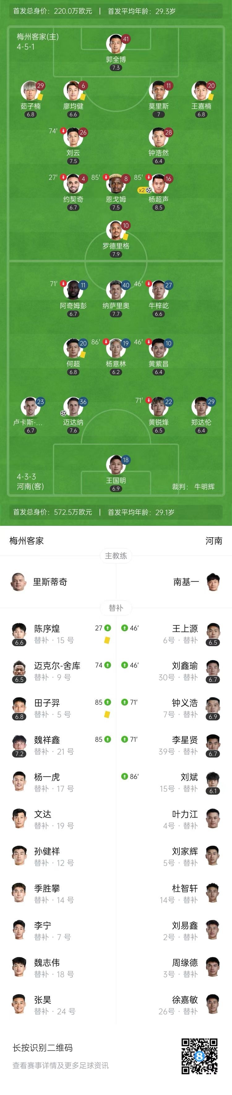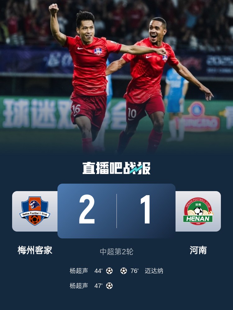 3月1日讯 北京时间3月1日19:35,中超第2轮,梅州客家坐镇主场梅州五华奥体中心迎战河南。上半场,约契奇受伤离场,杨超声小角度抽射破门,阿奇姆彭制造点球,纳萨里奥主罚被郭全博扑出。下半场,杨超声推射完成双响,恩戈姆任意球击中门框,迈达纳头球破门追回一球,补时阶段李星贤空门打中横梁错失绝平良机。全场比赛结束,梅州客家2-1战胜河南。梅州客家2战1胜1平,河南1平1负未尝胜绩。