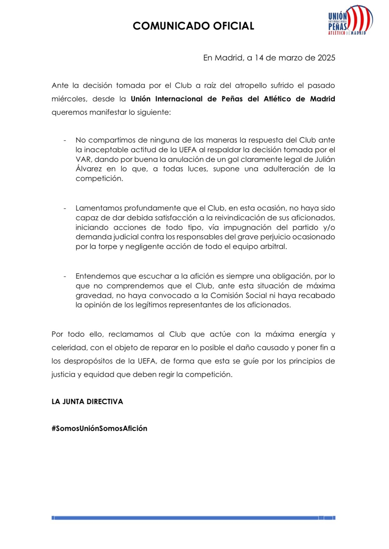 鉴于俱乐部因上周三发生的事件所做出的决定,马德里竞技国际球迷会联盟希望表达以下立场: